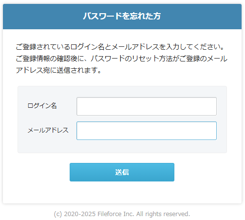 自身でパスワードをリセットする場合は、ログインページより「パスワードを忘れた方はこちら」リンクをクリックしてください。 その後、画面の案内にしたがい手続きを進めてください。